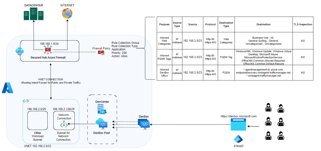 For secure yet flexible internet connectivity on DevBox, it’s crucial to configure your network correctly. Implementing SecuredHub, NVA, or any firewall device will disable public network connectivity by default. This ensures security without compromising developer productivity. However, to maintain the health of DevBox, allow access to its necessary URLs and service tags.