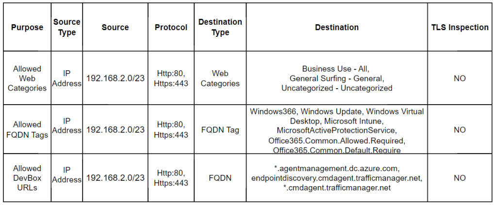 Allowed FQDN Tags: Essential for network requirements of DevBox and Windows 365. Without these, you risk unhealthiness, errors, or broken access.